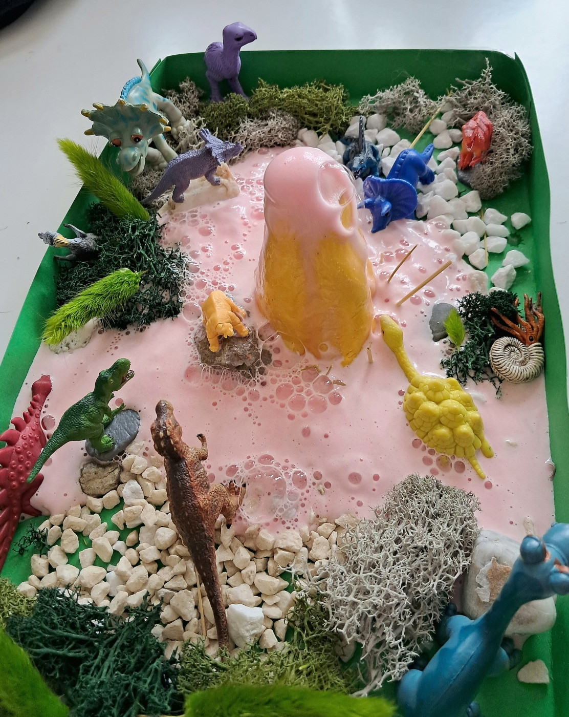 Als die vorbereitete Mischung in das Innere gefüllt wurde, begann der Vulkan zum Leben zu erwachen: Langsam stieg das „Magma“ nach oben, bis es schließlich durch den Krater hervorquoll und als „Lava“ die von den Schüler*innen modellierte Landschaft überrollte.
