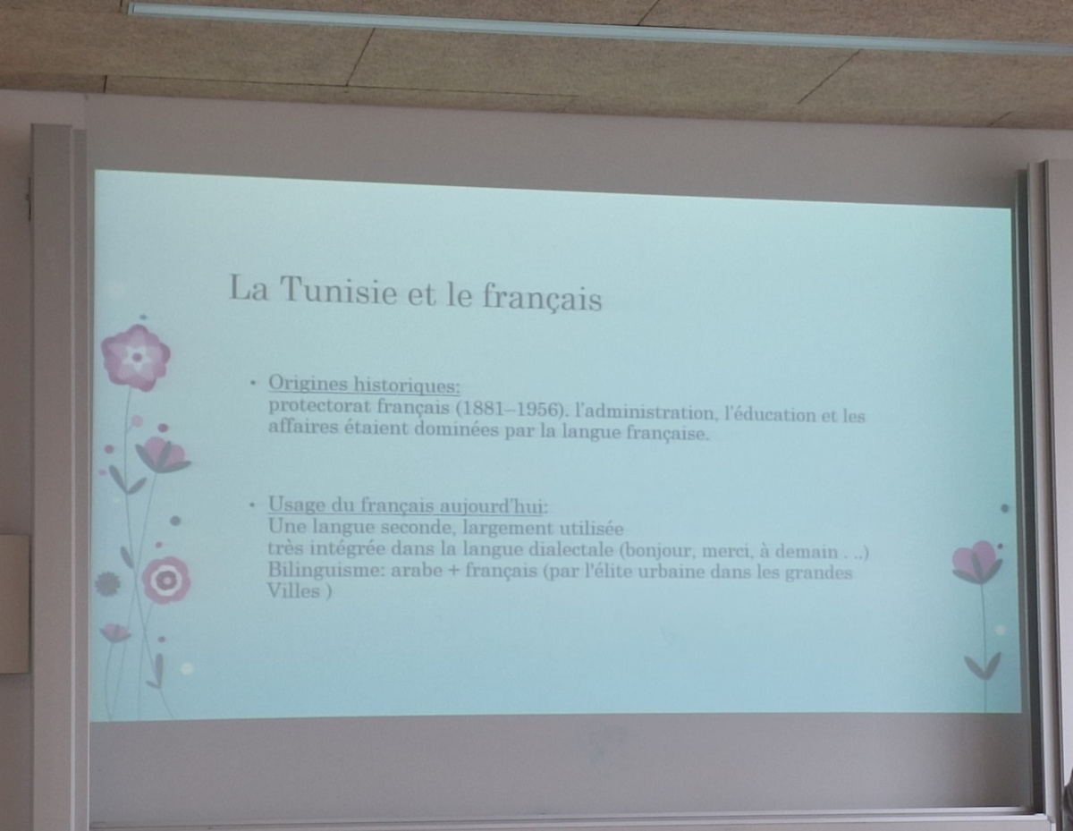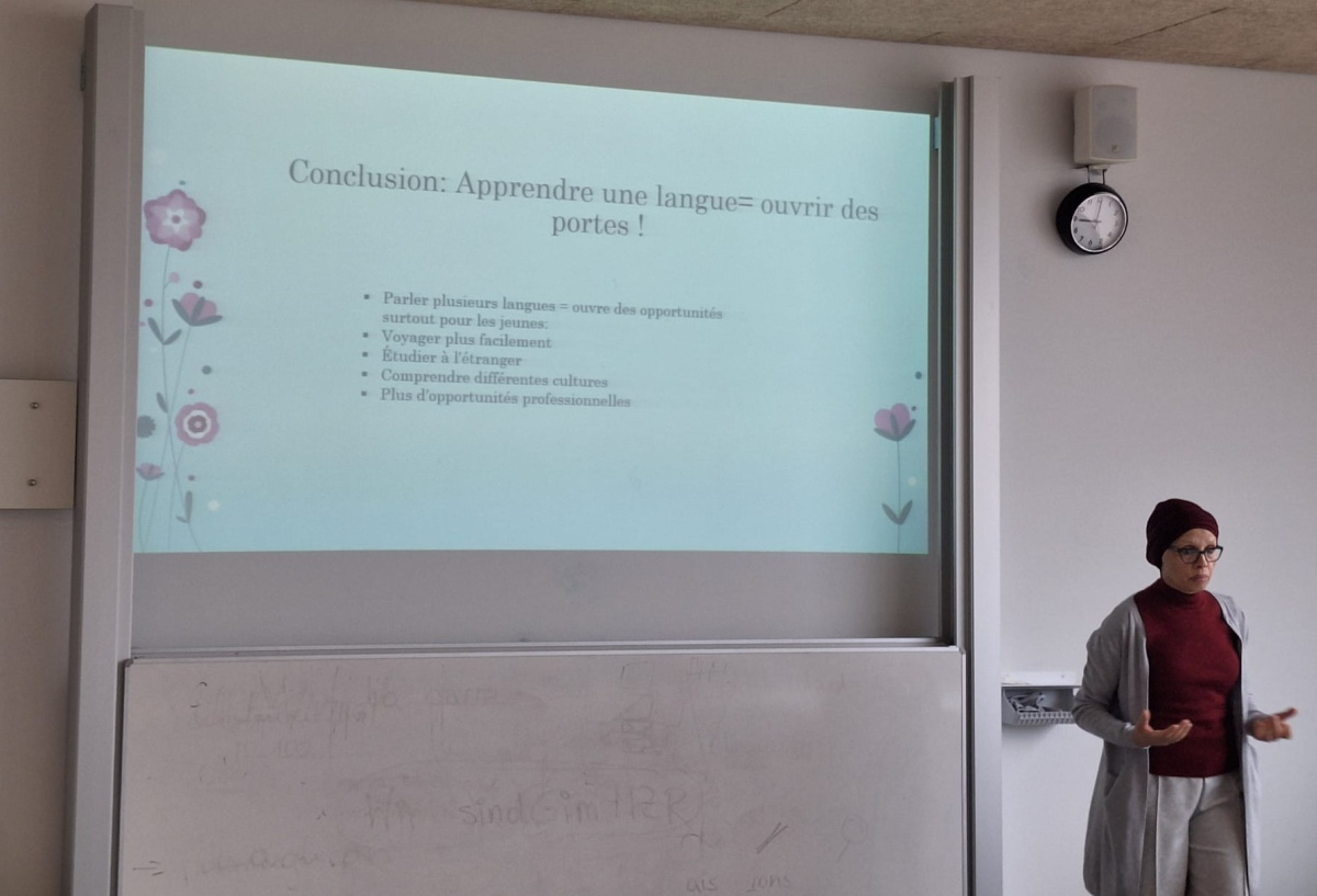 Im Zentrum stand ein lebendiger Einblick in ihr Herkunftsland Tunesien - ein Land voller kultureller Vielfalt, das sie bis heute prägt, auch wenn Österreich längst zu ihrer zweiten Heimat geworden ist. Die Schülerinnen und Schüler lernten dabei nicht nur die kulturelle Vielfalt Tunesiens kennen, sondern setzten sich auch mit der Rolle der französischen Sprache im Alltag auseinander. Im anschließenden Gespräch, welches auch Raum für Fragen und Austausch bot, wurde deutlich, wie sehr (Fremd)Sprachen dazu beitragen können, Brücken zwischen unterschiedlichen Lebenswelten zu bauen.