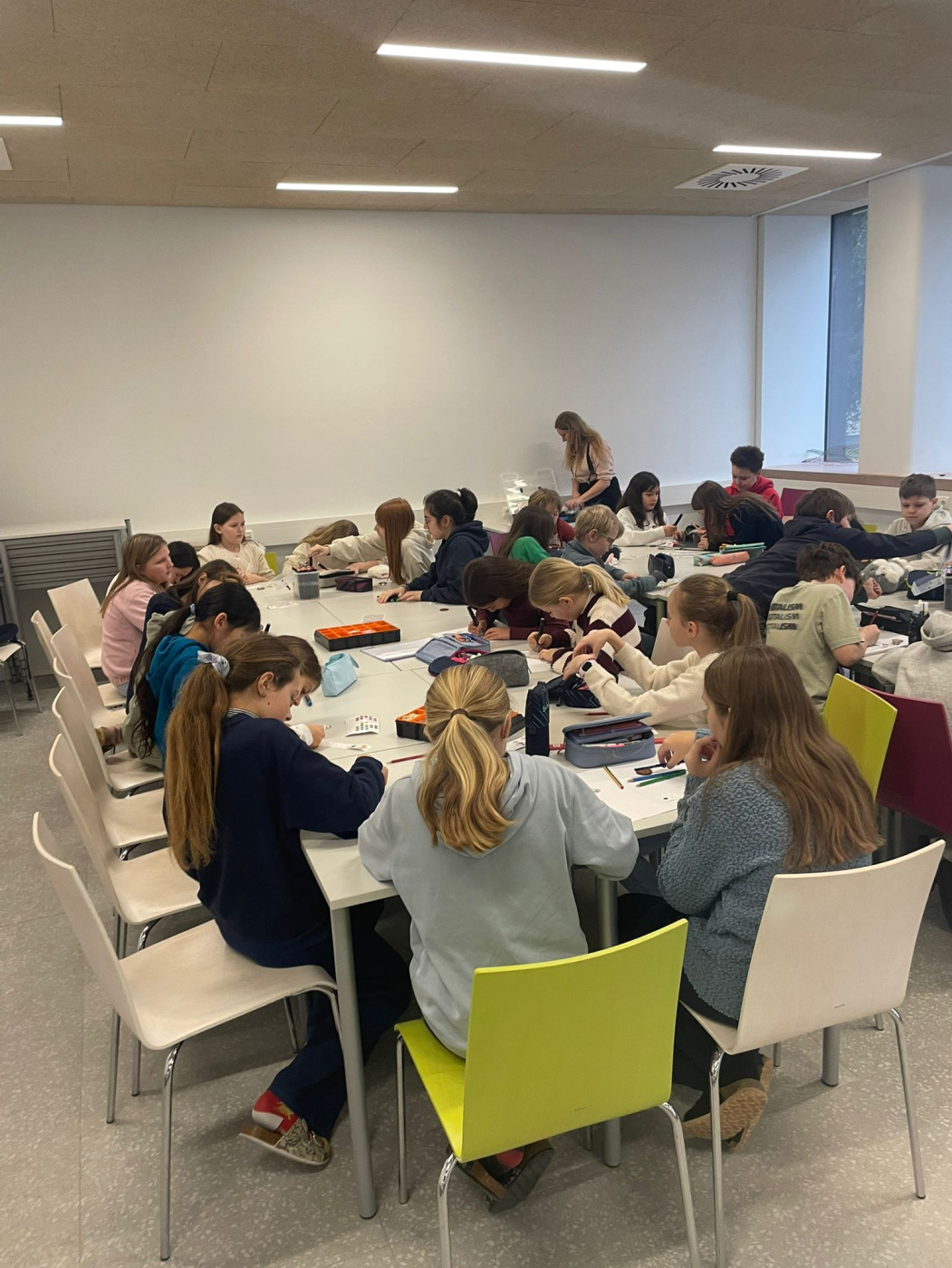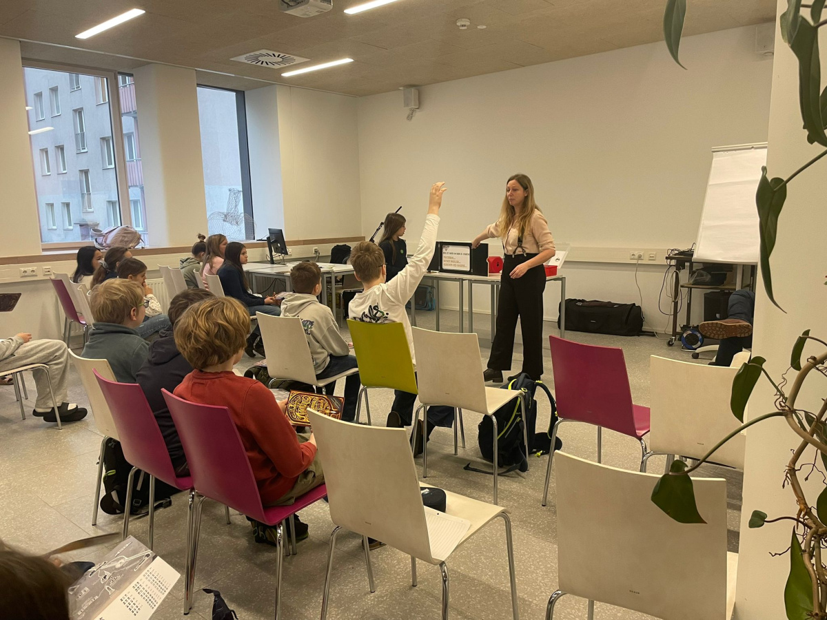 Agatha und das Geheimnis der magischen Halskette versuchten die Schüler*innen der 1A und der 1AD bei einem interaktiven Leseworkshop gemeinsam mit der Autorin Andrea Eder-Morawetz zu lösen. Sie besuchten auf ihrer Reise durch die fantastische Sagenwelt Wiens den magischen Sternwartepark, kämpften mutig mit dem gefährlichen Wassermann am Ufer des Wienflusses und plauderten mit dem lieben Augustin am Fuße des Stephansdoms. Marlene als Assistentin der Autorin und ein wunderbares grünes Amulett halfen den Kindern auf ihrem Weg durch ihr Abenteuer. Sie würfelten, lösten Rätsel, ließen aber auch das Glück entscheiden.