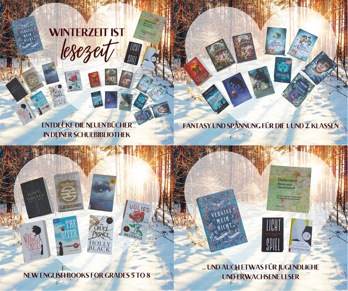 Auch wenn sich der Winter bald seinem Ende zuneigt, laden noch genügend lange Abende und trübe Tage dazu ein, sich mit einem guten Buch in eine gemütliche Ecke zu kuscheln und in neue Welten einzutauchen. Die Schulbibliothek versorgt euch dafür mit vielen neuen Titeln, beispielsweise diverse Fantasy-Serien für 10- bis 12-Jährige, einige neue englische Romane für die Oberstufe und die brandneuen Bestseller von Kerstin Gier, Daniel Kehlmann und Tonio Schachinger.