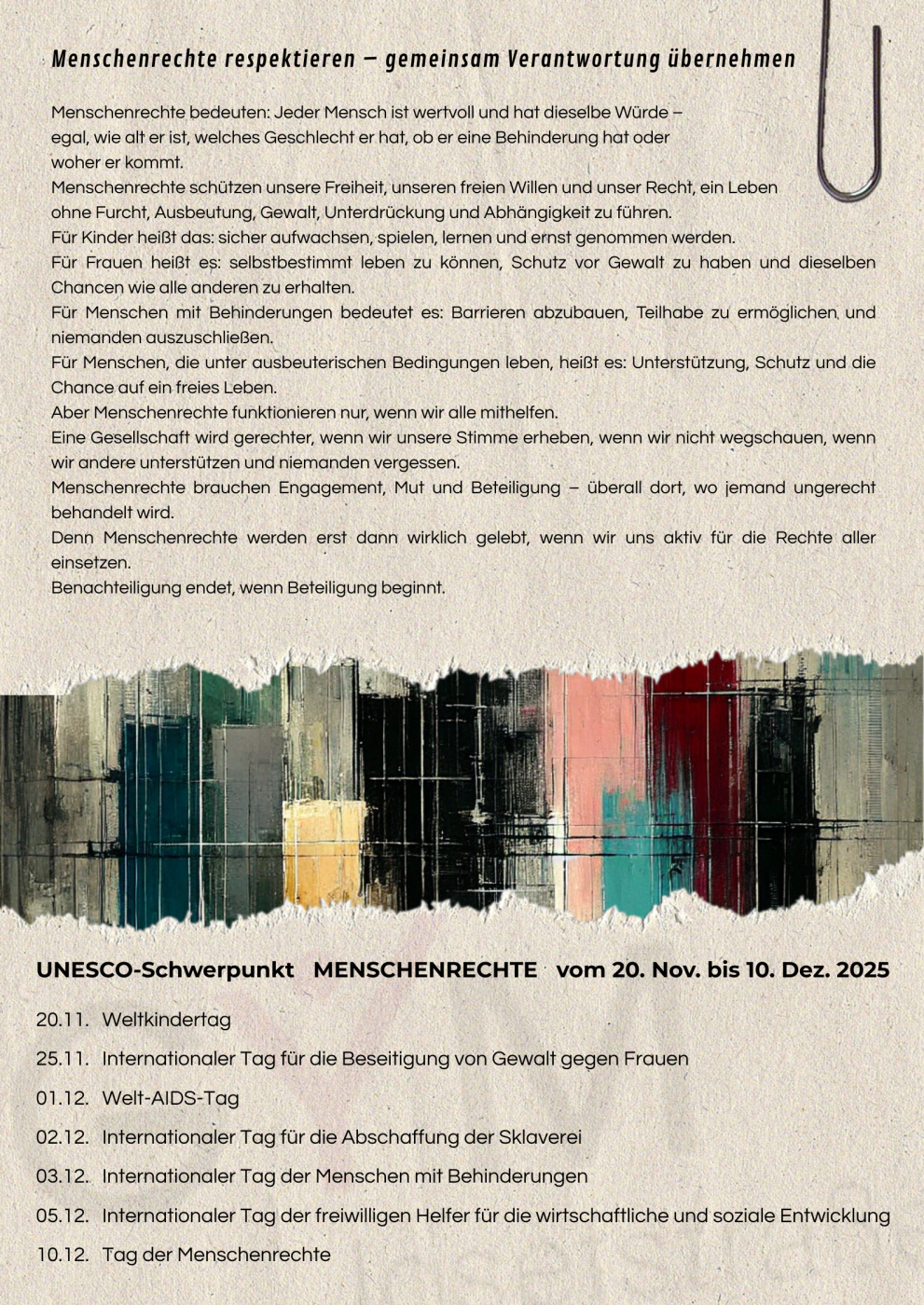 Vom 20.November bis zum 10. Dezember widmen wir uns im Rahmen unseres UNESCO-Semesterschwerpunkts dem Thema "Menschenrechte". Einige Internationale Tage der Vereinten Nationen dienen als Anlass zur Auseinandersetzung mit den Rechten verschiedener Gesellschaftsgruppen. In unterschiedlichen Gegenständen und Projekten wollen wir unseren Blick auf Menschenrechte schärfen, Diskriminierung aufdecken und uns aktiv mit der Frage nach einem besseren, menschenwürdigen und solidarischen Miteinander auseinandersetzen, gemäß dem diesjährigen Motto “Benachteiligung endet, wenn Beteiligung beginnt.”