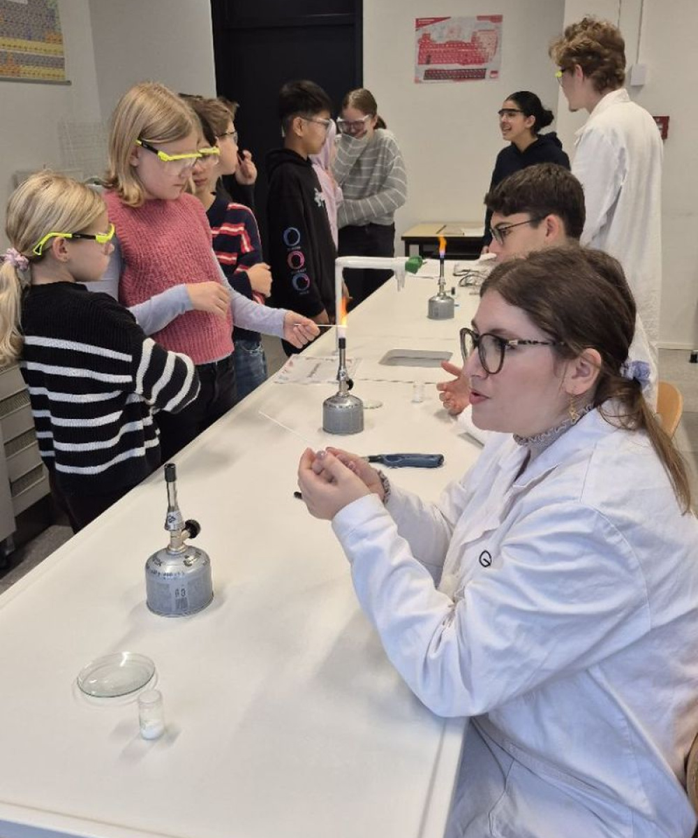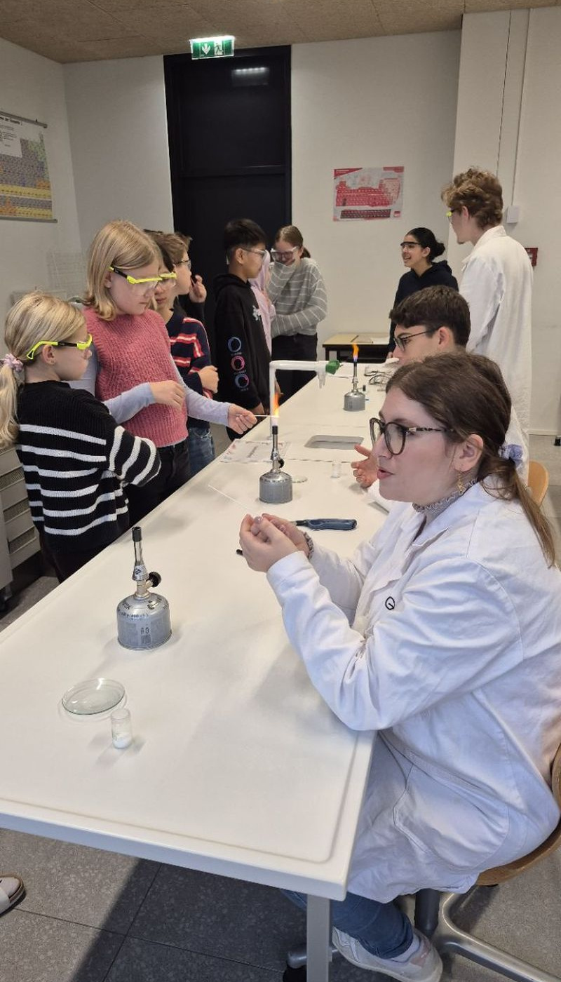Die Klasse 8N übernahm dabei eine zentrale Rolle: Sie entwickelte einen abwechslungsreichen Stationenbetrieb in den Fächern Chemie, Biologie und Physik und führte die jüngeren Kinder mit viel Engagement durch die einzelnen Experimente.